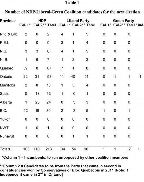 From Elections Canada data I have compiled a set of tables that provide the factual basis for a winning election strategy. On the basis of the procedures cited above, Table 1 shows that in the next election the NDP would be entitled to run 213 candidates, the Liberals 90, and the Green Party 2. However, Table 2 is of greater consequence since it shows that in the 2011 election there were 64 constituencies where the combined NDP-Liberal-Green vote exceeded the Conservative or the Bloc Quebecois vote. In the next election, a coalition candidate, from the party with the greatest vote, would have a strong likelihood of winning the seat. In this manner the NDP could theoretically win an extra 27 seats and the Liberals 36, but the Greens may not be able to gain any extra seats. Although the Greens came in second in one constituency in Ontario, the Conservative won by more than 50% so it would be difficult – but not impossible – for a coalition Green candidate to win the seat.