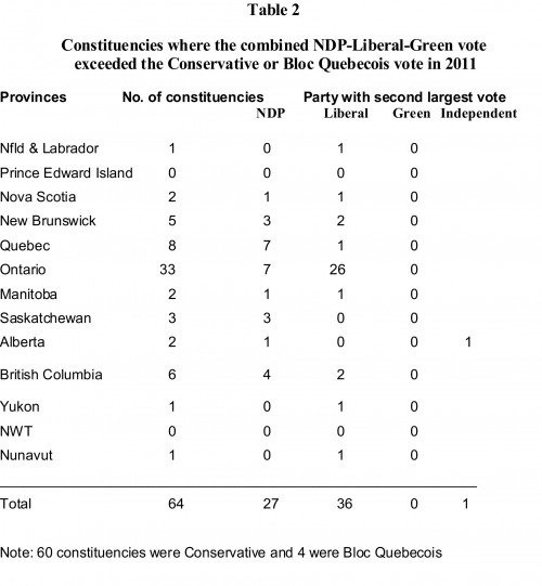 Table 3 shows that in the next election, with this strategy, the NDP could theoretically win up to 130 seats, the Liberals 70, and the Green Party could win 1 and maybe 2 – for a majority coalition government of 201 seats. In such a coalition it would seem reasonable that cabinet seats would be determined on the basis of the proportionate share of members in the government, with 65% going to the NDP, 35% to the Liberals, and perhaps the 1 Green Party member could be included.