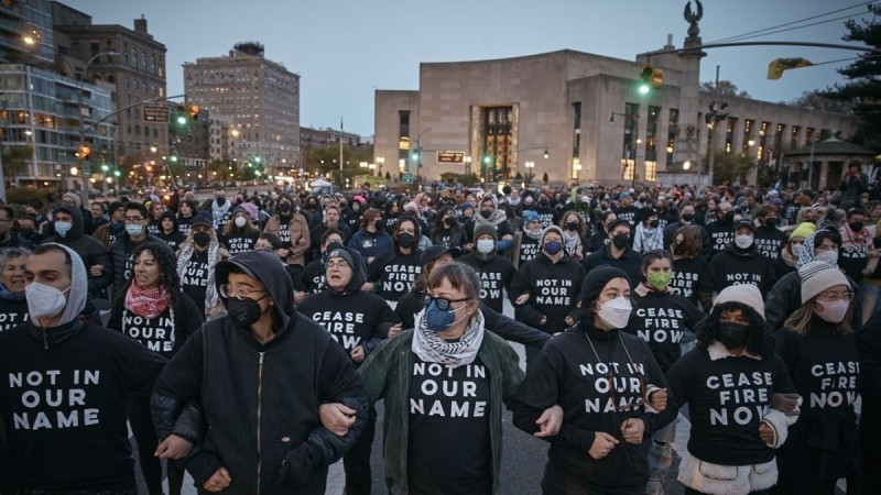 Protesters block traffic during a pro-Palestinian demonstration demanding a permanent ceasefire in Gaza, near the home of Senator Chuck Schumer in Brooklyn, April 23, 2024. Photo by Andres Kudacki/AP.
