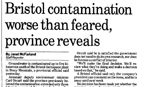 During what the Winnipeg Free Press described as a “stormy public meeting” with the company and province at Stony Mountain’s curling rink in early 1992, a resident whose water had been poisoned quoted from a report published in 1949 that warned of the likelihood of large-scale usage of the same industrial solvents leading to groundwater contamination. A former worker at Winnipeg’s Bristol plant in St. James also claimed that the company had dumped chemicals into the sewers over the course of the almost three decades that he had worked there.