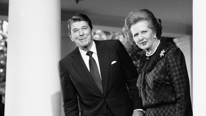 Former US President Ronald Reagan and former British Prime Minister Margaret Thatcher at the White House in 1982. Both political figures were key players in the neoliberal turn of the 1970s. Photo by Gerald Penny.