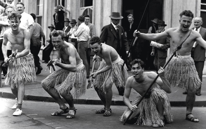 The mock haka performed by Auckland University engineering students in 1955. Photo courtesy the Auckland War Memorial Museum Tamaki Paenga Hira.