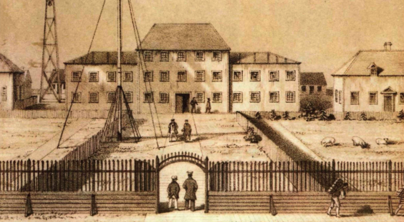 Coloured lithograph showing the Hudson’s Bay company headquarters at York Factory, Manitoba in 1853. Image courtesy Library and Archives Canada/Wikimedia Commons.