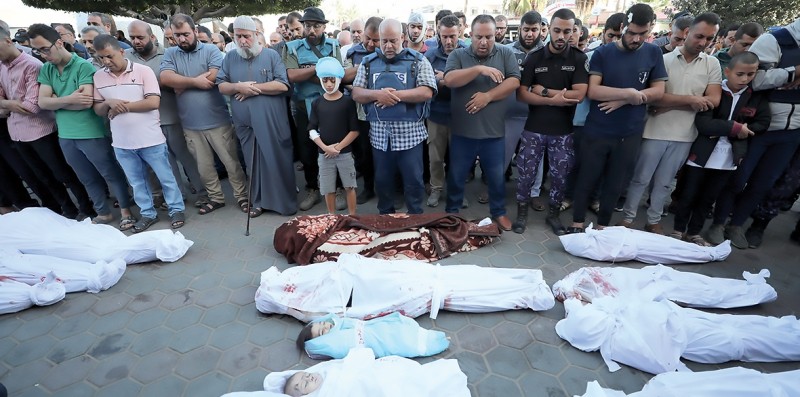 Al-Jazeera correspondent Wael Dahdouh, centre, prays over the bodies of his wife, son, daughter, and grandson, killed in an Israeli airstrike on Nuisserat refugee camp, outside a hospital in Deir al Balah, south of the Gaza Strip.