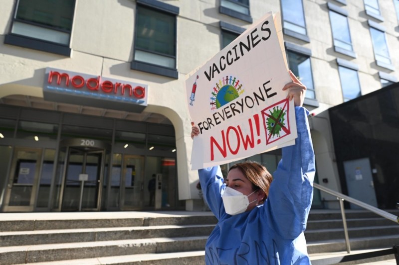 Protesters at Moderna’s headquarters call for vaccine patent waivers and expanded global access during the COVID-19 pandemic. Photo by Philip Blenkinsop.