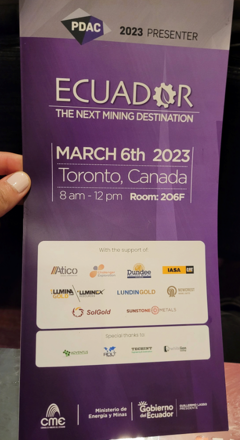 Pamphlet gathered at PDAC 2023 during a session entitled “Ecuador: The Next Mining Destination.” Photo by Viviana Herrera.