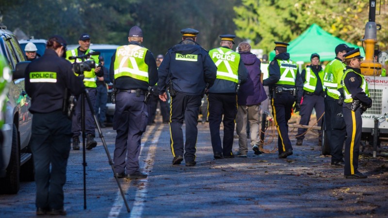 Police at the scene of protests against the Trans Mountain pipeline expansion project in Burnaby, BC, November 22, 2014. Photo by Mark Klotz/Flickr.